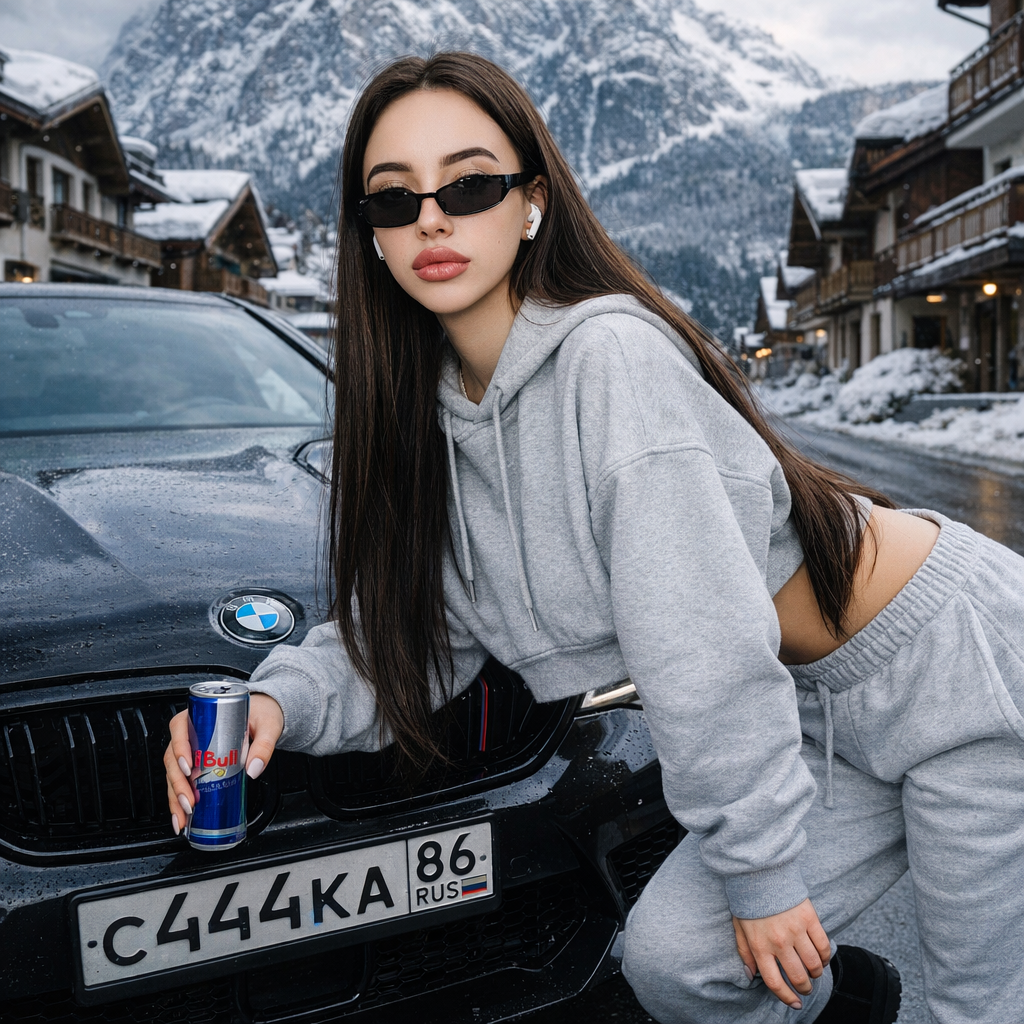 Ультрареалистичное фото 8К, мое лицо на 100% сохранено точно так же, как загружено. Девушка, наклоняясь возле капота, смотрит в камеру, корпус немного наклонён вперёд опирается на машину, рядом с черным BMW M5 F90 .Девушка одета светло серый оверсайз спортивный костюм с кофтой укороченной ,штаны свободного кроя, на низкой посадке ,видно тонкую спортивную талию на ногах у нее черные уги, солнцезащитные очки Y2K,
