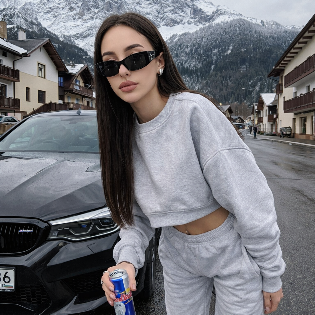 Ультрареалистичное фото 8К, мое лицо на 100% сохранено точно так же, как загружено. Девушка, наклоняясь возле капота, смотрит в камеру, корпус немного наклонён вперёд опирается на машину, рядом с черным BMW M5 F90 .Девушка одета светло серый оверсайз спортивный костюм с кофтой укороченной ,штаны свободного кроя, на низкой посадке ,видно тонкую спортивную талию на ногах у нее черные уги, солнцезащитные очки Y2K,
