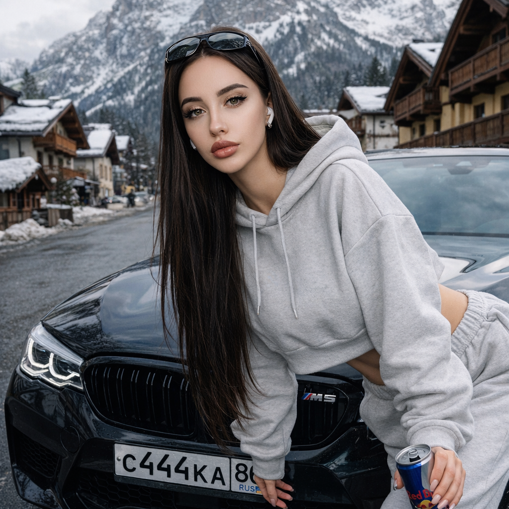 Ультрареалистичное фото 8К, мое лицо на 100% сохранено точно так же, как загружено. Девушка, наклоняясь возле капота, смотрит в камеру, корпус немного наклонён вперёд опирается на машину, рядом с черным BMW M5 F90 .Девушка одета светло серый оверсайз спортивный костюм с кофтой укороченной ,штаны свободного кроя, на низкой посадке ,видно тонкую спортивную талию на ногах у нее черные уги, солнцезащитные очки Y2K,