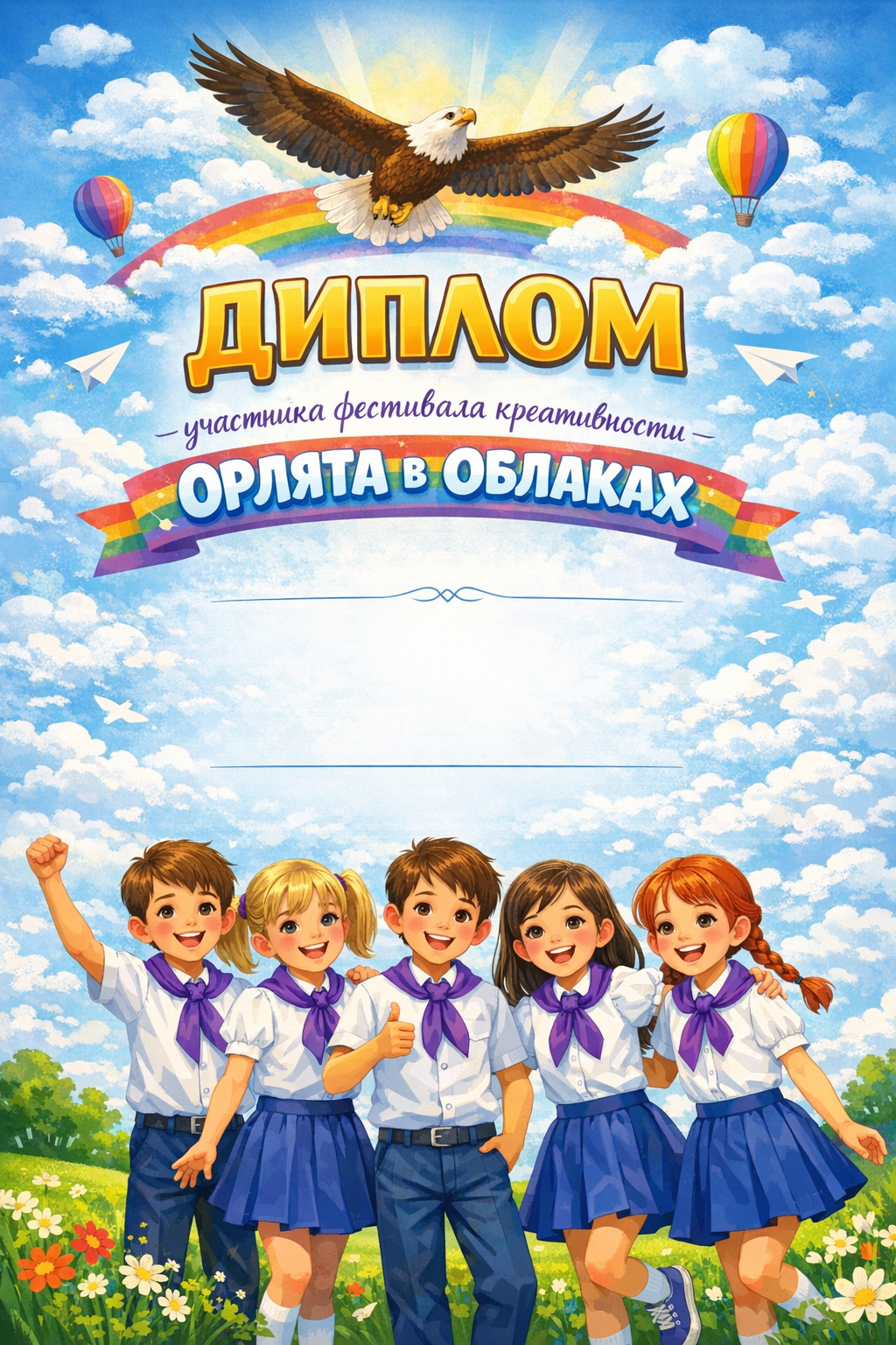 Яркий дизайн диплома для детского фестиваля с изображением школьников в форме на фоне неба. Светлая и радостная композиция передает атмосферу беззаботного детства, созданная нейросетью Chat gpt image 1.5 для творческих