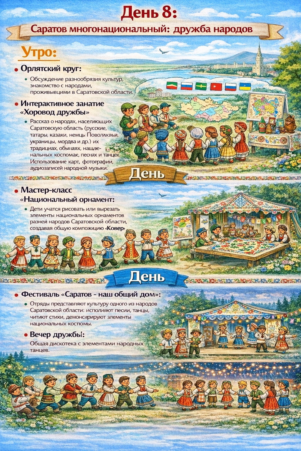 o Мастер-класс "Национальный орнамент": Дети учатся рисовать или вырезать элементы национальных орнаментов разных народов Саратовской области, создавая общую композицию "Ковер дружбы".