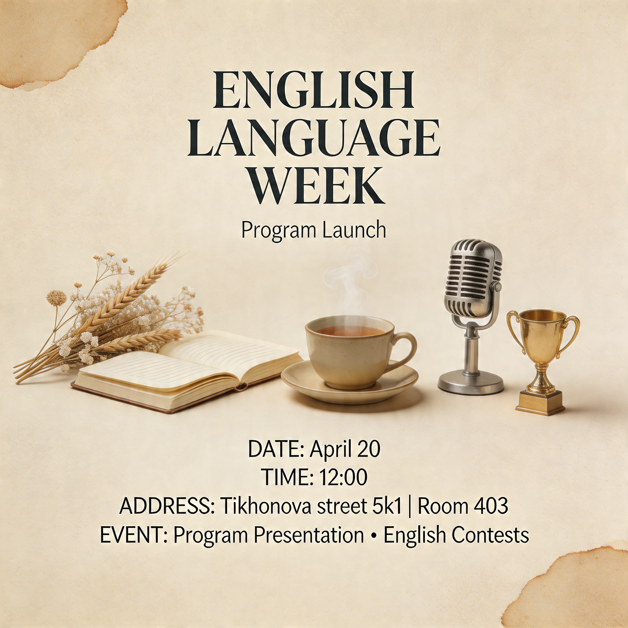 Create an aesthetic, moody vertical poster for university students. Theme: program launch called "English Language Week". Title in elegant, slightly vintage typography: English Language Weak. Subtitle: "Program Launch". Include date: April 20, time: 12:00, address: Tikhonova street 5k1, room 403. Event includes: presentation about the program and contests. Style: soft aesthetic, warm desaturated tones (cream, beige, dusty blue, faded orange), film-like lighting, gentle shadows. Background: subtle textures like old paper, coffee stain edges, or soft grain. Elements: dried flowers, a cup of tea, an open notebook, a vintage microphone, a small trophy. No cartoon characters. Typography: elegant serif for title, thin sans-serif for details. Vertical format (A2). Text in English. Cozy, nostalgic, and inspiring.