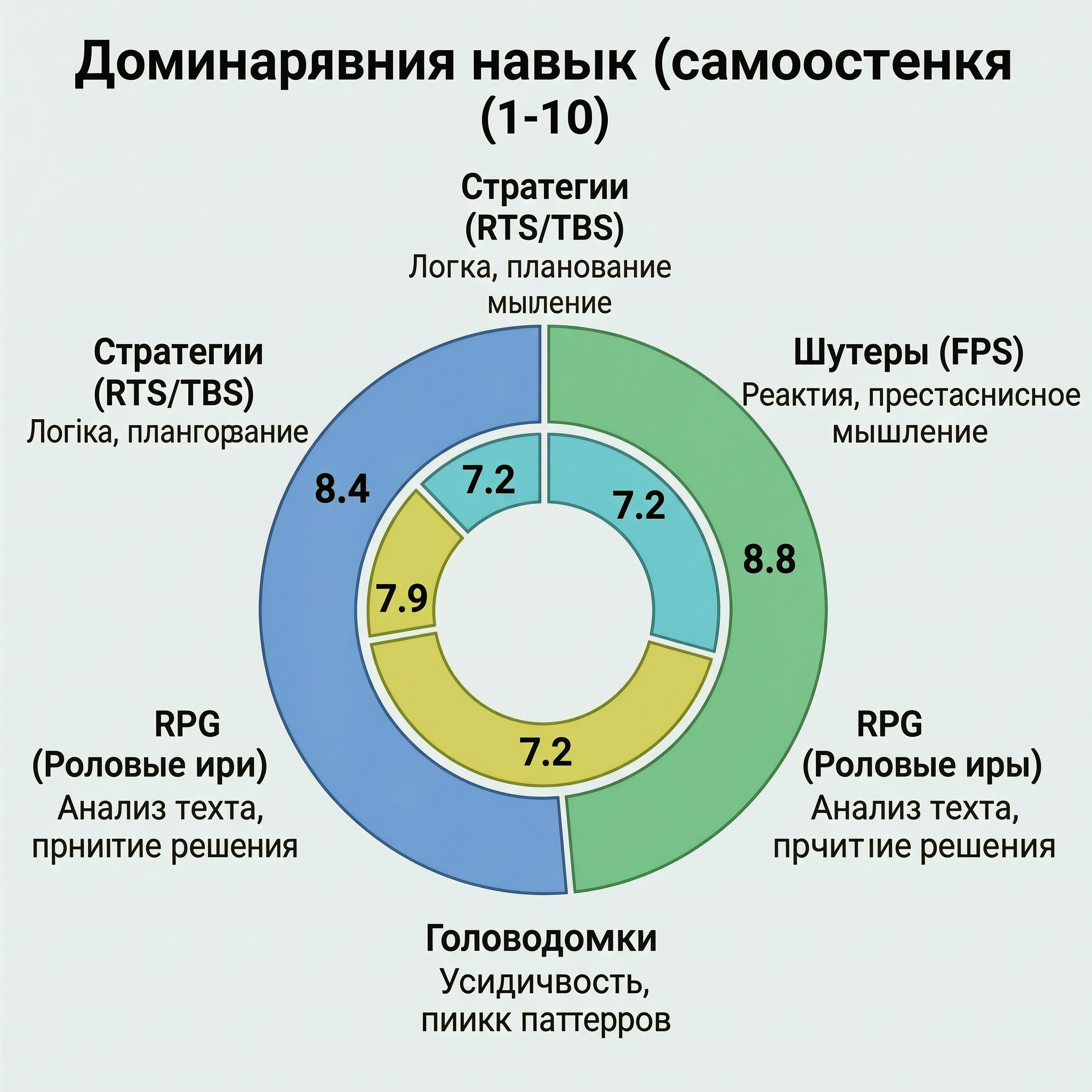 Инфографика круговой диаграммы самооценки игровых навыков по жанрам — результат генерации ИИ WAN 2.7 Image Pro. В работе видны подписи, смысловые блоки, связи между элементами, центральная схема и контрастные цветовые.
