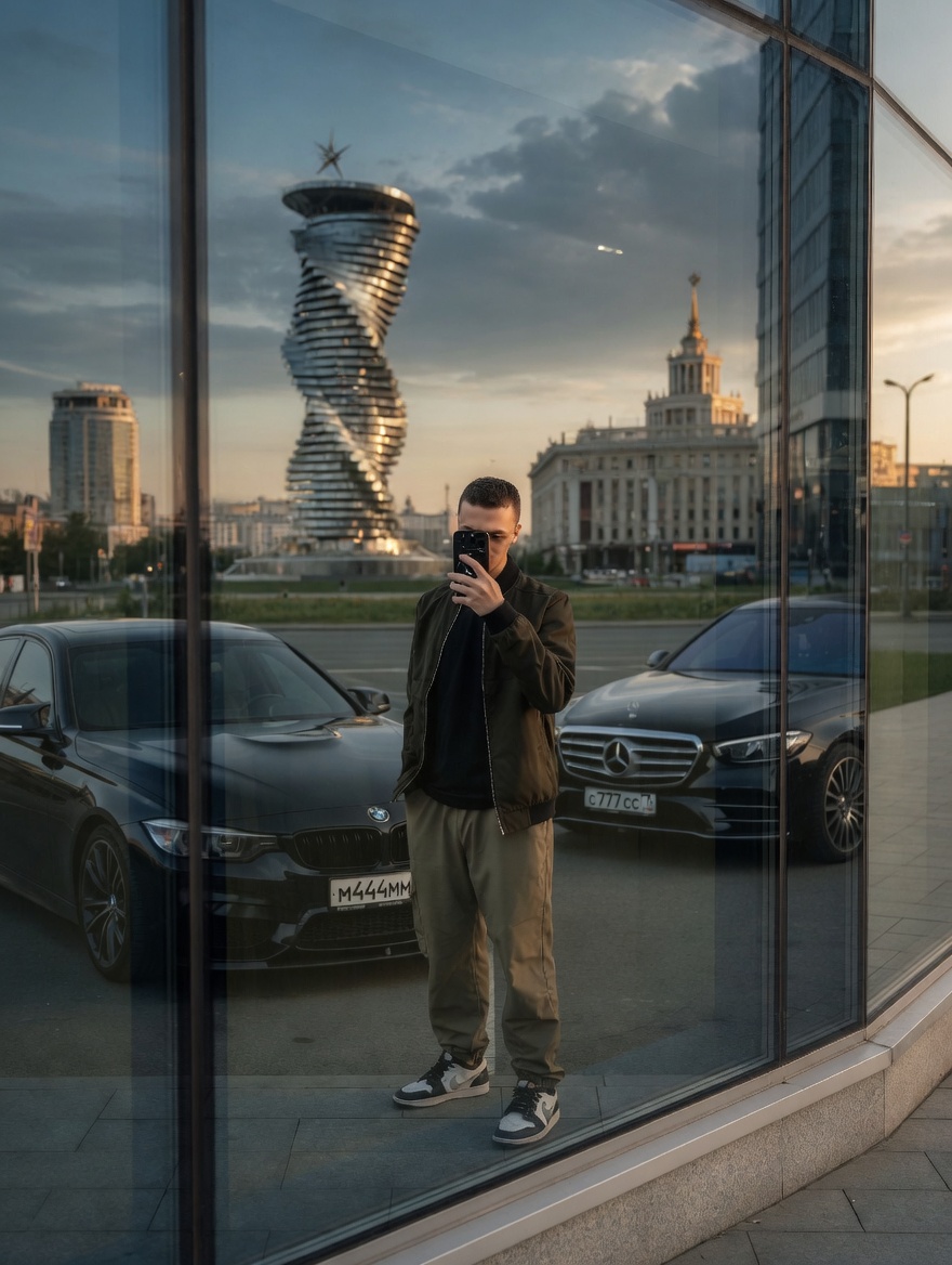 Фото в отражении здания Челябинска от нейросети Grok Imagine