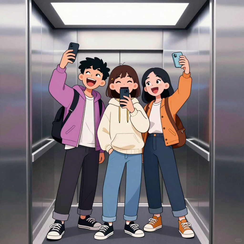Промпт: "Three teenage cartoon characters in an elevator, laughing and taking selfies. Bright elevator interior with metallic walls. Stylized 2D animation, expressive faces, dynamic poses. One boy has phone in hand. VHS filter, slight grain. Style: creepy cartoon with simplified features."