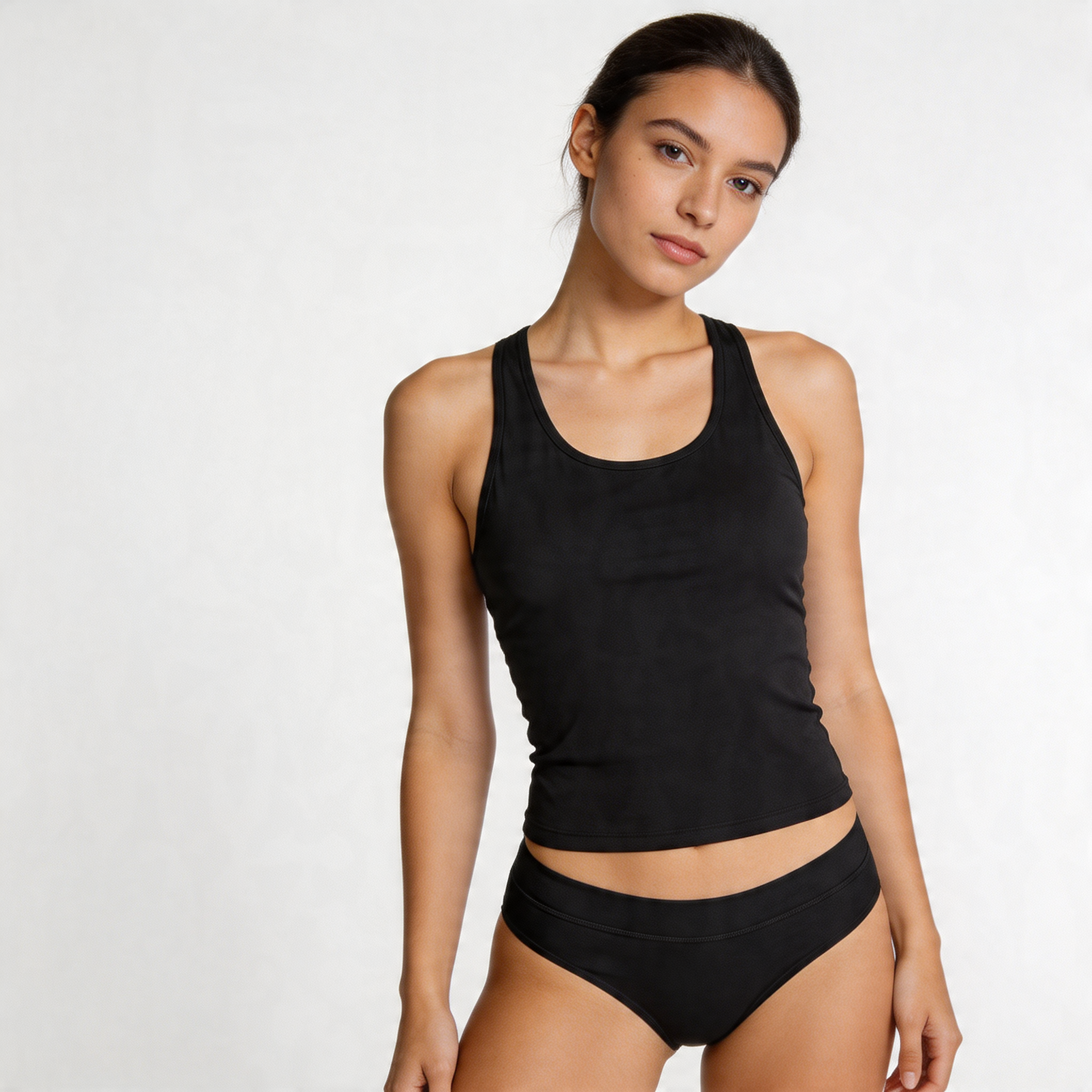 Спортивная женщина в топе и нижнем белье запечатлена в полный рост. Наклон головы и асимметрия плеч с тазом создают естественную динамику позы на этом качественном изображении, выполненном в Seedream 5 Lite.
