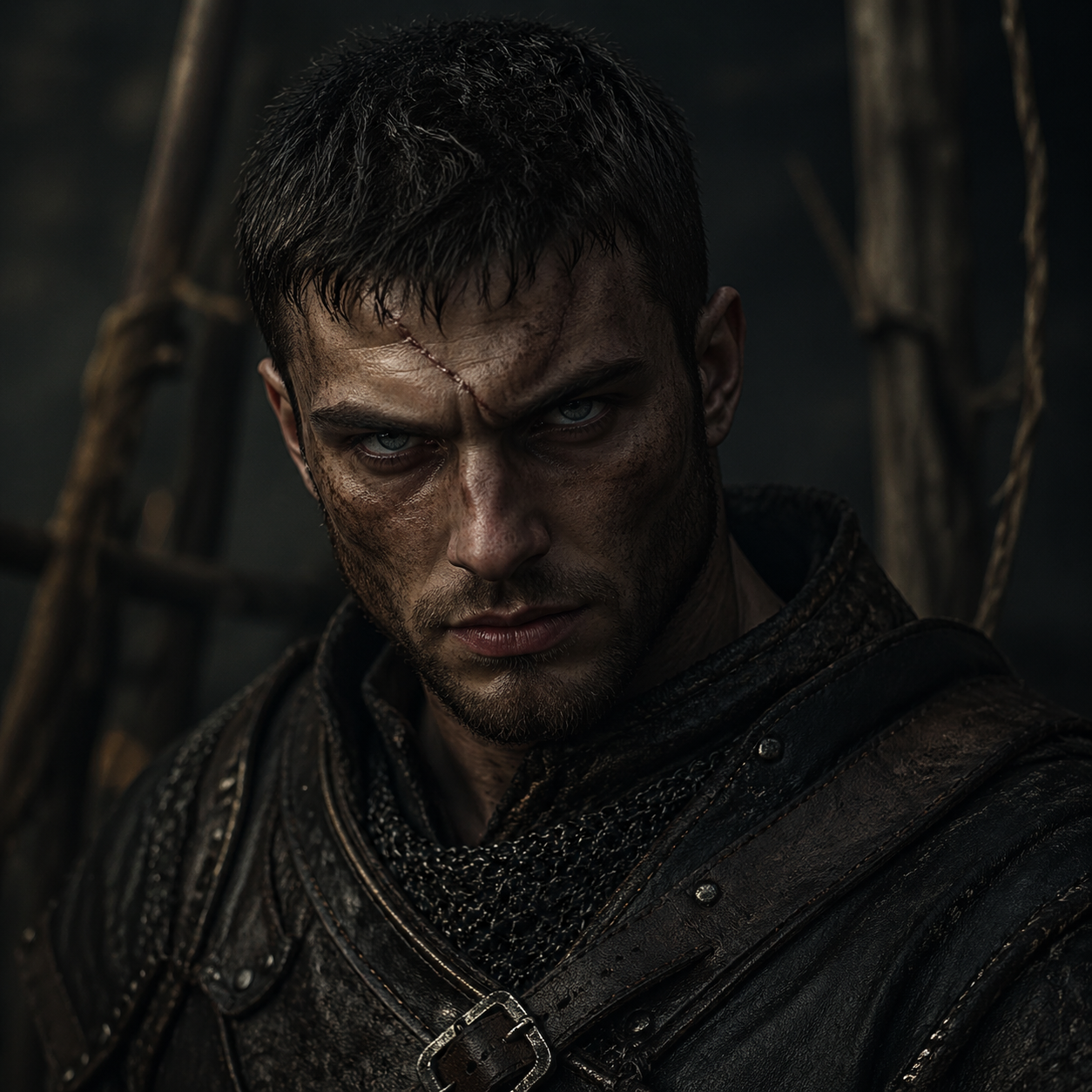 Грязный воин в стиле мрачного фэнтези, 26 лет, острые хищные черты лица, стально-серые глаза, короткие темные волосы, обветренная кожа, рваный шрам через бровь, потертая кожаная броня поверх кольчуги, угрюмое освещение, темная атмосфера, стиль Ведьмака, кинематографичный реализм, высокая детализация.